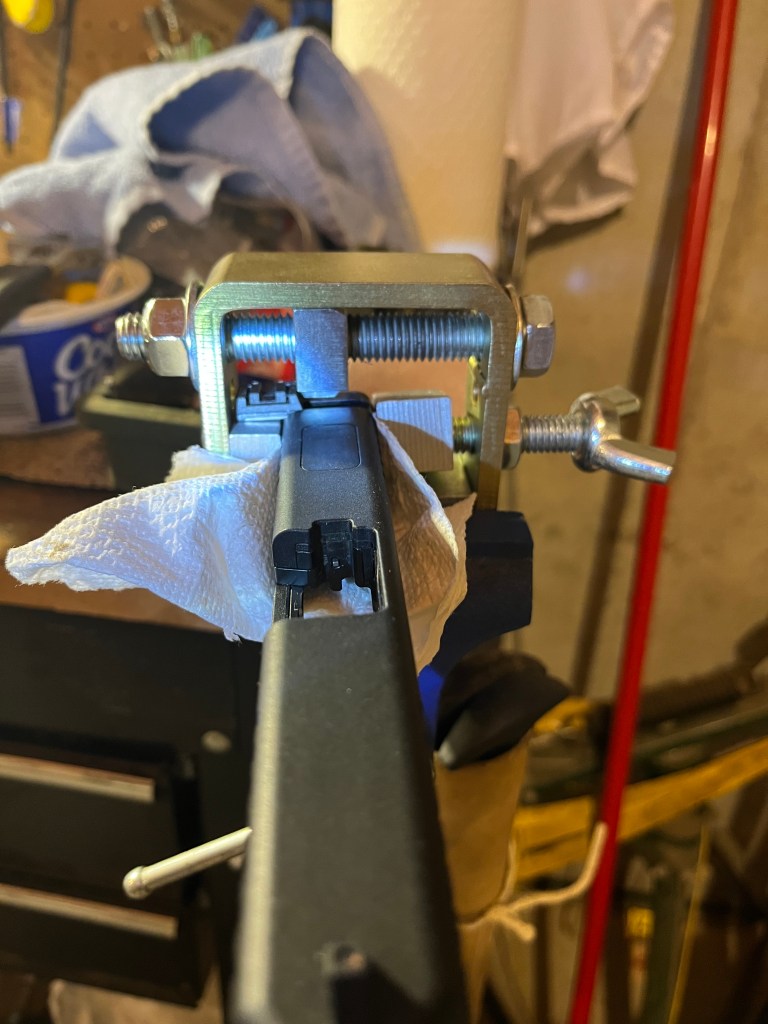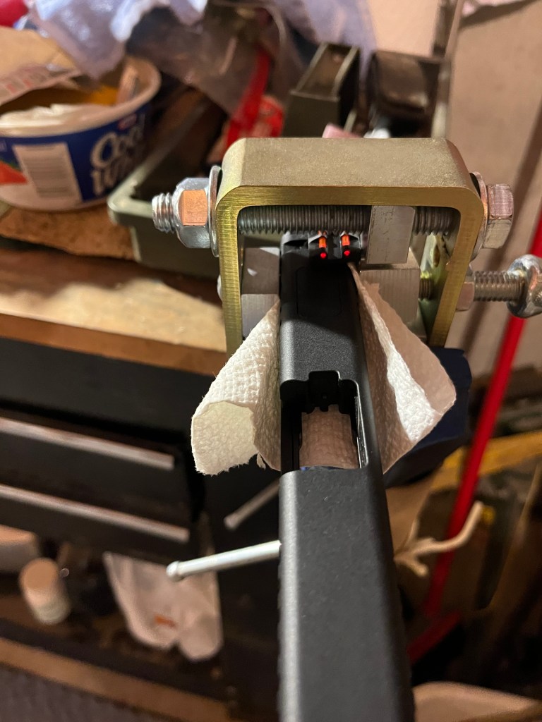 First, the old standby – put the (unloaded) gun into a plastic baggie and jam as hard as possible into the holster. Make sure to push on the back of the slide; otherwise, you’ll just be pushing the frame in. (And, if loaded, you could end up chambering a round.)