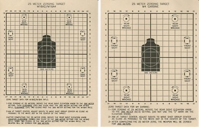 These are the targets that the US military sets out at 25 meters (just over 27 yards). By shooting at these close up targets, you can make the required adjustments to the front and rear sights to zero the rifle to the center of the target.