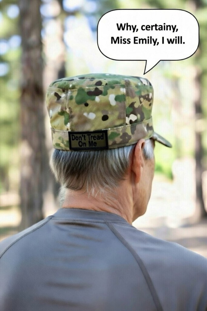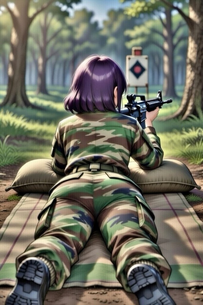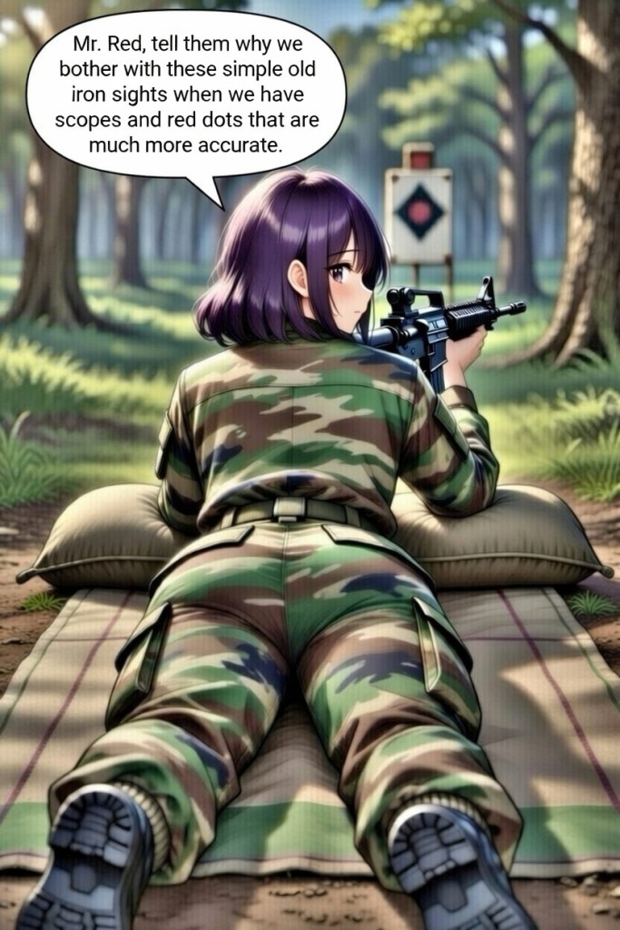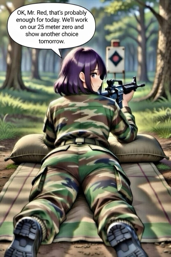 Here, you can see Emily aiming off to the right of the target with the early “carrying handle” and fixed front sight of the original M16 and AR 15.