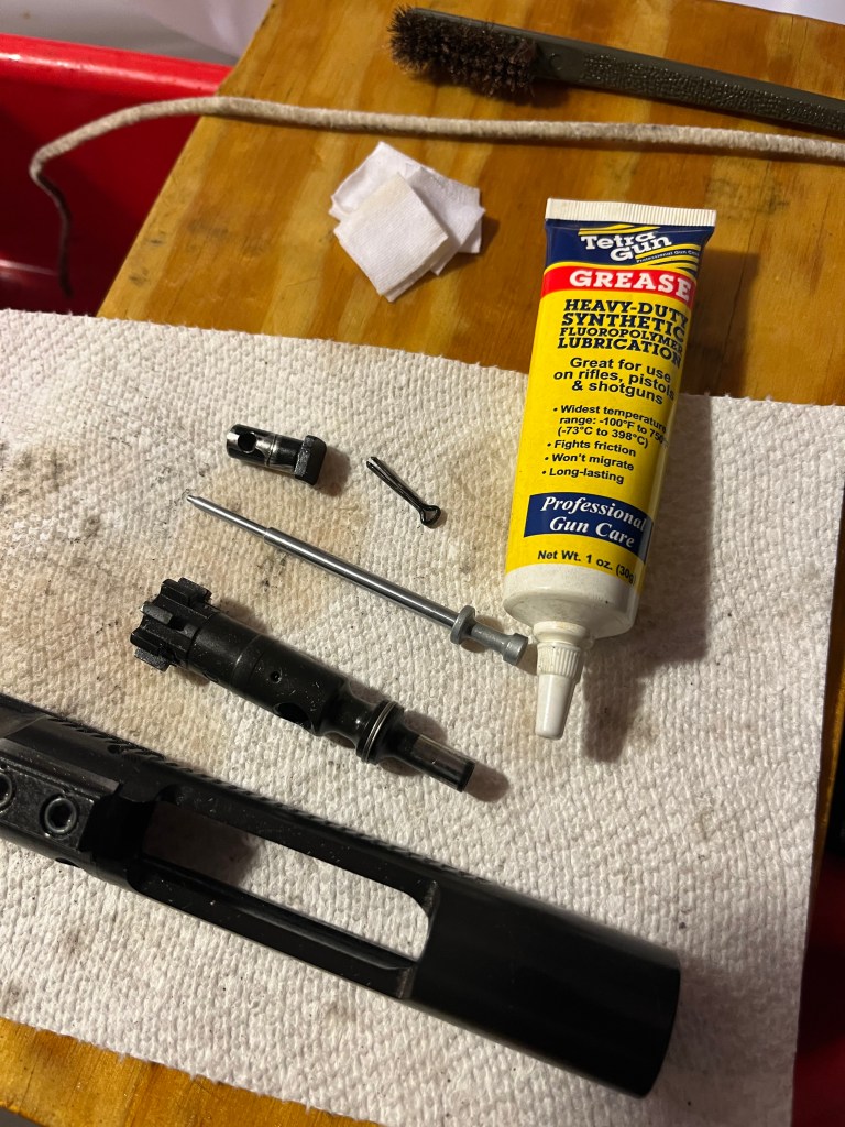 Now, this is my personal choice to use a film of grease for bolt lube. I don’t use it on firearms that will be sitting around a long time – it will cake up. Those guns get CLP or Rem Oil. But I do like it for a regularly used gun.